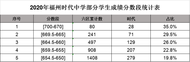 在2020年福州市一级达标高中自主招生中,时代共99人被录取,其中73人被福建师大附中“润德创新人才培养实验班”录取,7人被福建师大附中空飞基地班录取,4人被一中植基计划录取,3人被三中自招录取,提前录取总人数位居全市初中校第一。此外,在一三附等学校自招录取生中,中考成绩670分以上的有13人,650分以上的有74人。