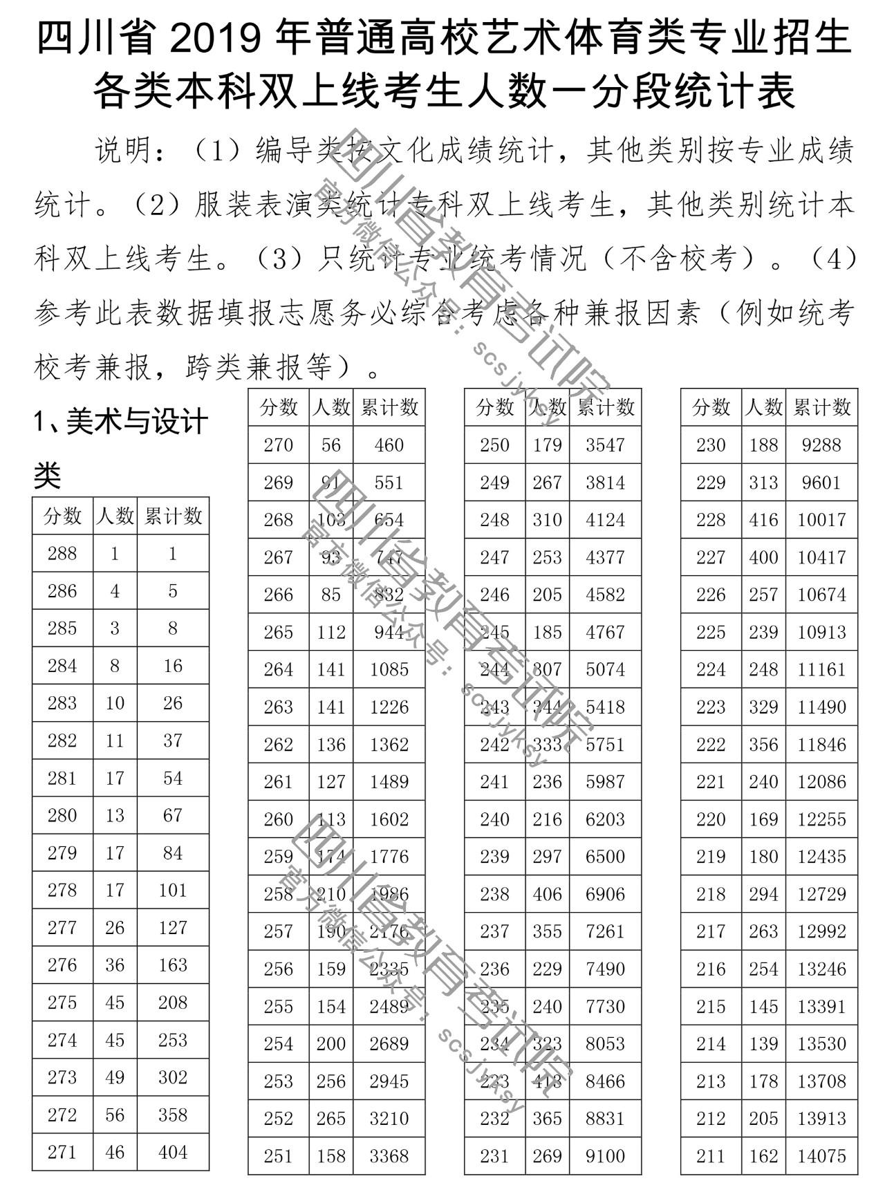 四川省2019年度普通高校艺术体育类专业招生各类本科双上线成绩分段表已经出炉。为便于考生和组织专业校考的招生学校了解专业统考成绩分布情况,现把专业统考成绩达到参加校考资格线考生的专业总分一分段统计表进行公布,供考生和招生学校查阅。