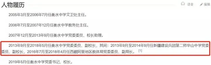 2013年9月至2018年5月,任衡水中学党委委员、副校长(其间:2013年9月至2014年9月(共12个月)任新疆建设兵团第二师华山中学党委委员、副校长,2016年7月至2018年4月(共10个月)任西藏阿里地区教体局党委委员、副局长);