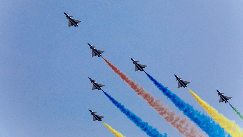 随着发动机的轰鸣声,余旭与队友驾驶飞机从天安门前飞过,地面上是为他们欢呼的人群,天空上是飞机经过留下的彩烟,他们在天空中穿过长安街上的大厦,随后紧急降低高度,将战机的身姿刻在每个人的脑海中挥之不去。