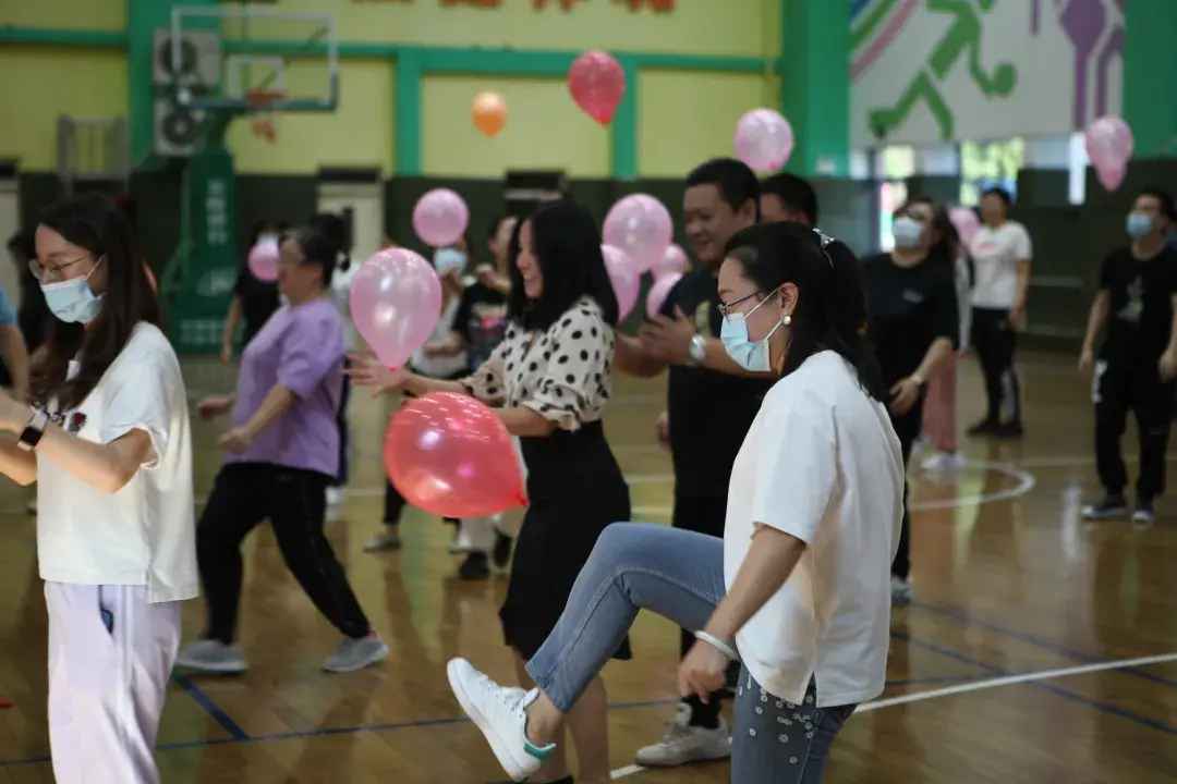 运动会在有趣的气球操中拉开了序幕,在教练的带领下,繁忙工作了一上午的老师们分别用身体的不同部位撞击气球,五颜六色的气球伴在篮球馆的上空此起彼伏,最后老师们两两一组互相传递气球,并在教练的要求下两人合力压爆了气球,随着“砰砰”气球爆炸的声音,响起来一片笑声,仿佛工作的压力和辛苦都随着消失了。