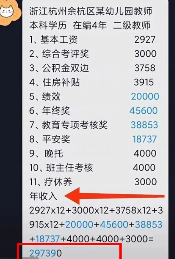 光凭这两个奖,就已经叫很多人吃惊了,再加上其他的几项,整体算下来,杭州这位幼师一年的工资接近了30万元,很多幼师一年薪资也就四五万,杭州这位幼师居然将近30万,整整翻了好几倍,真的可以说是“天价”工资单了。