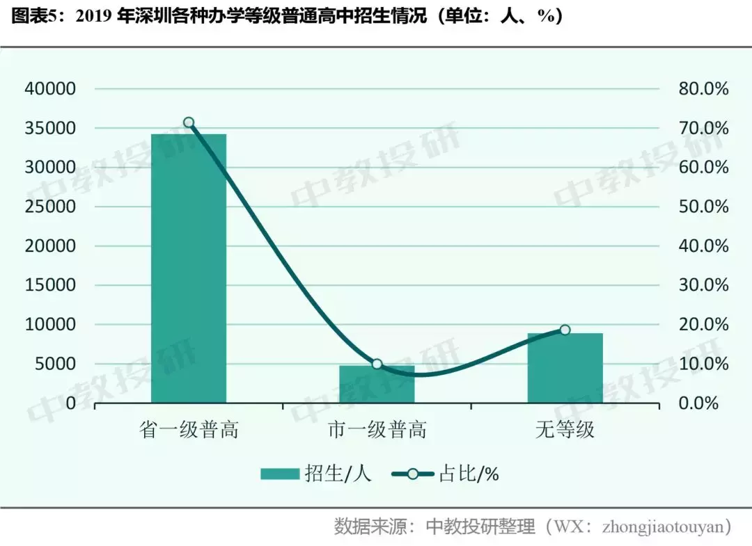 统计显示,2019年深圳的普高累计招生人数为47897人,其中公办普高招生34981人,占比为73%,民办普高招生12916人,占比为27%。