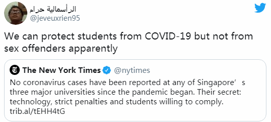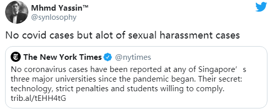前段时间,《纽时》官推上发了篇关于新加坡三所大学新冠0病例的文章,里面赞美了这些学校在疫情方面所做的努力。