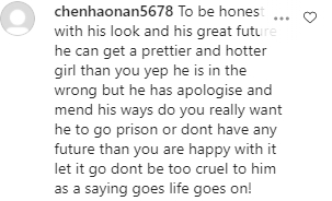 “讲真的,凭他的长相和前程,完全能找个比你漂亮比你辣的女孩。没错,他确实做得不对,但他也道歉并改过自新了,你真的希望他进监狱吗?还是希望他没有任何未来?过去的就让它过去吧,不要对他太残忍,因为生活还要继续!”