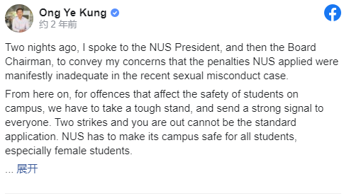 连新加坡教育部长也出来发声,督促各个大学对待校园安全违法行为采取强硬措施。