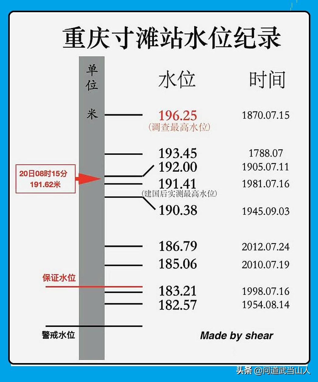7月18至19日,嘉陵江大洪水和长江上游洪水在重庆相遇,形成长江干流特大洪水。重庆朝天门水位高达198米,创数千年来新高。重庆磁器口记载:“大雨十天,江上漂流人、物七日之久”。寸滩站最高洪水水位为196.25m,比1981年高4.74m,估算最大洪峰流量为103000 m³/s (1981年寸滩洪峰流量85700 m³/s,2020年寸滩爆发三峡大坝建成后的最大洪峰74600 m³/s)。