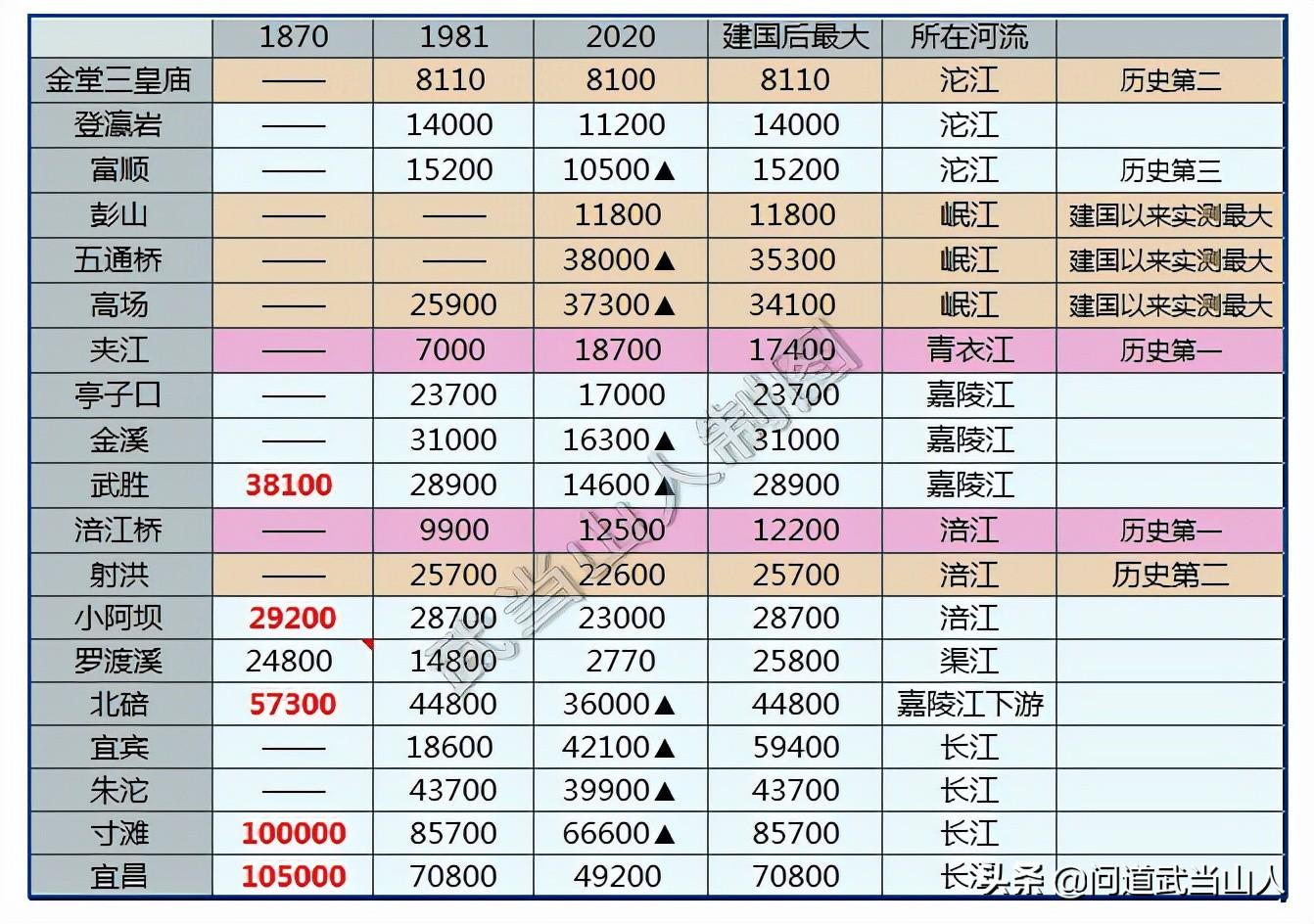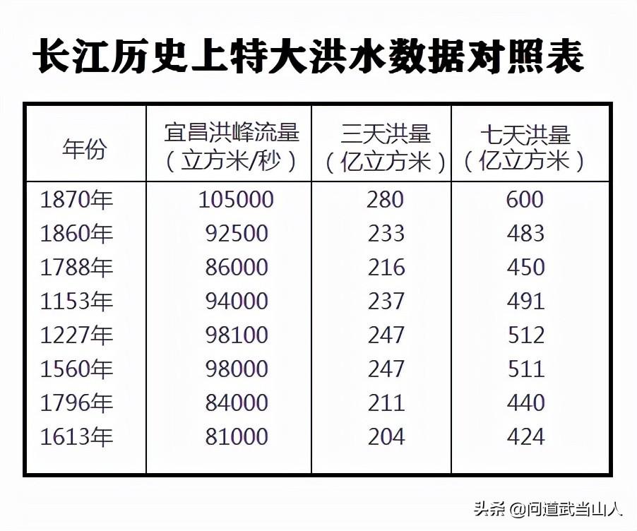 如果把1954年与1870年两次洪水水文测量进行比较,宜昌站1870年洪水位比1954年约高3.8米,宜昌河段最大洪峰流量达105000立方米/秒,超过60000立方米/秒的大型洪峰整整持续了半个多月。