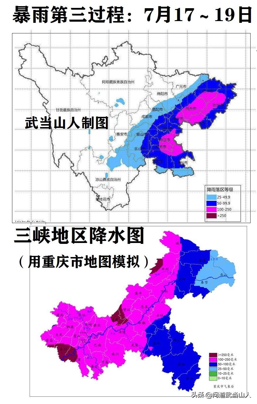第三个过程7月17~19日(农历6月19至21日),暴雨区主要在川东南及长江干流重庆至三峡区间。江津县记载:“六月十九日大水入城,仅有板桥街人可往来,其水直达泮池附城,民房倒塌数百家,三日乃退”;万县记载:“(六月)十九日夜子时大雨,经两日雨止”。;
