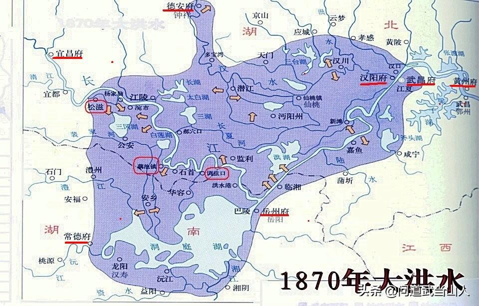由于洞庭湖面积广大,加上湖区堤围较矮,所以尽管1870年洪水呈滔天之势涌入湖区,但是在一万多平方公里的范围容纳了几百亿方洪峰之后,湖区水位仍然低于1954年1~2m左右。