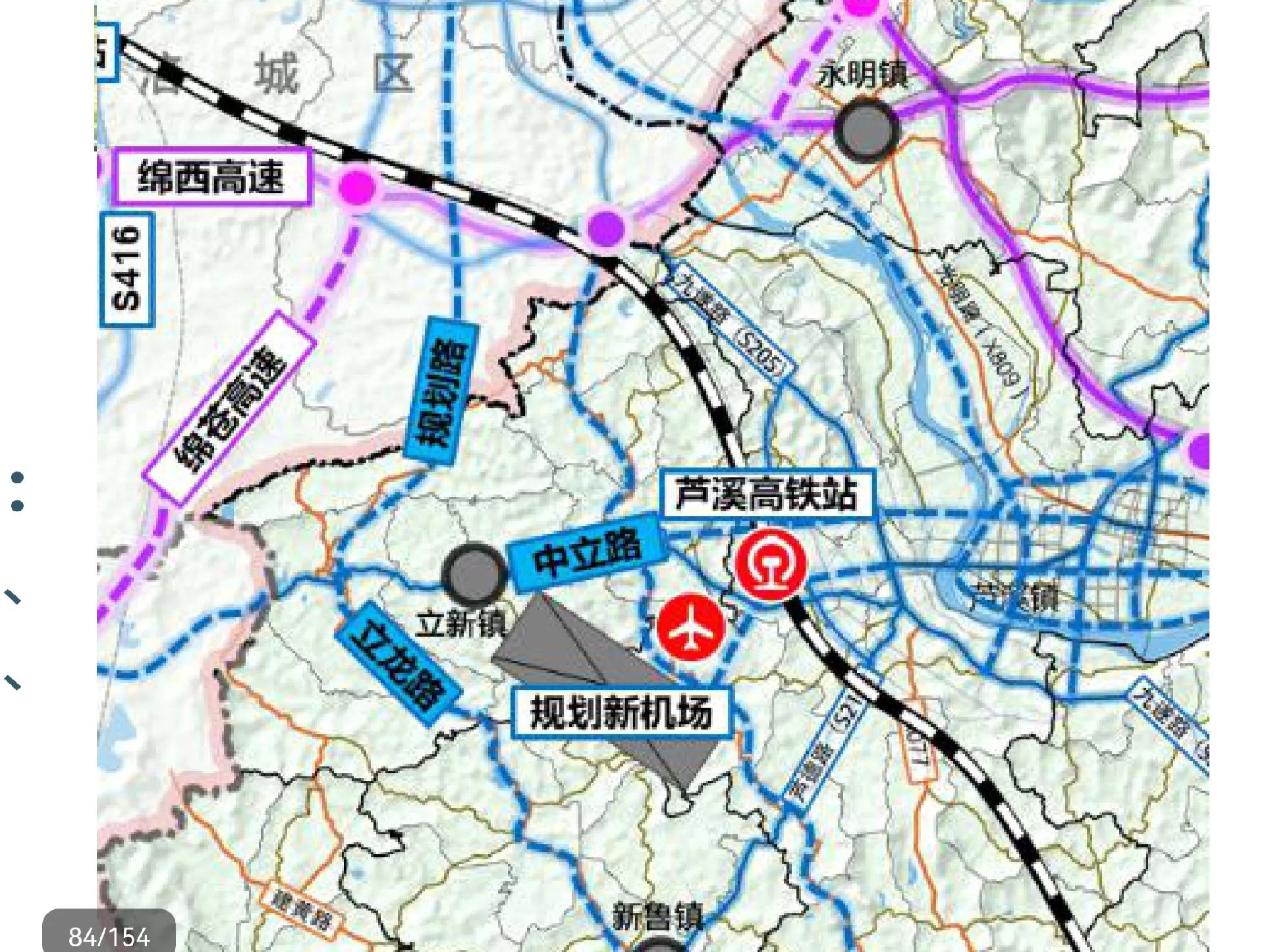 根据该规划示意图,传闻已久的绵阳新机场、绵遂铁路芦溪高铁站以及20万人口规模空港新城正式公开亮相!