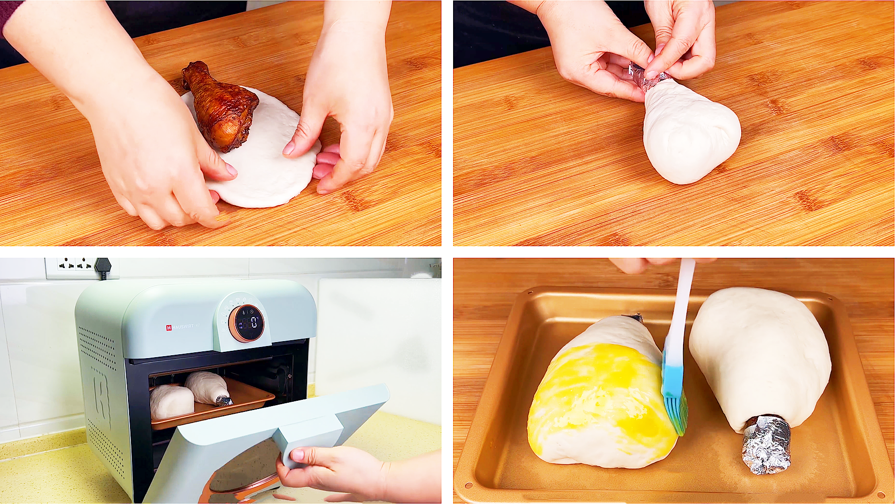 5、小圆饼全部擀好之后,取出烤好的鸡腿,直接放进面片里面,然后给它包裹起来,然后再用锡纸把鸡腿的尾巴地方给包裹起来,放在一边发酵至两倍大