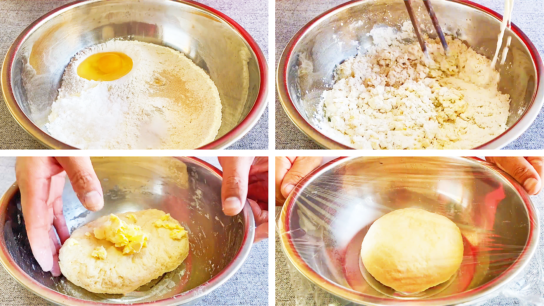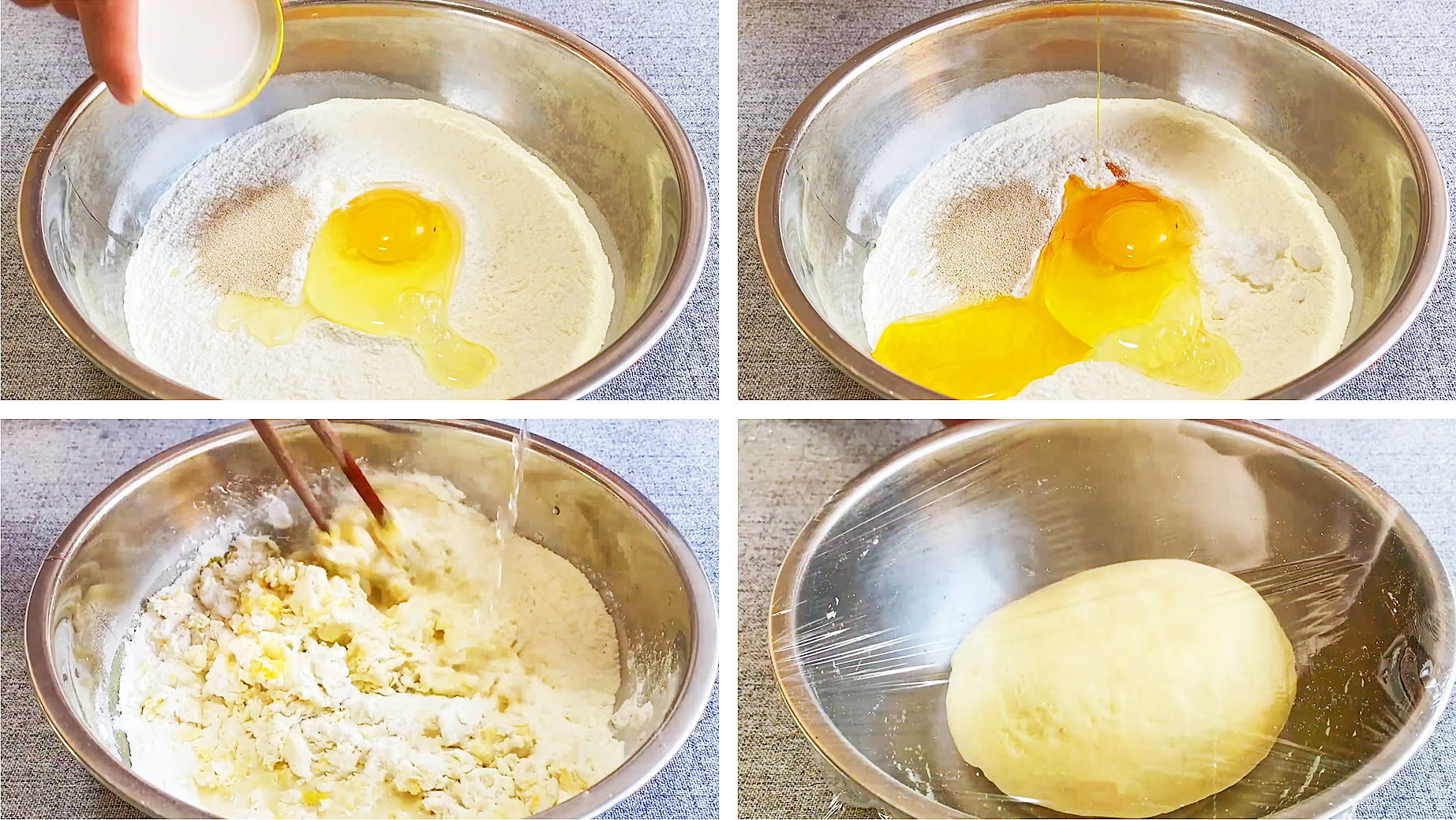 1、盆中倒入500克普通面粉,然后再打进去一个新鲜的鸡蛋,然后再添加5克酵母粉,再放入一些白糖促进发酵,然后再添加20克的食用油,充分的搅拌均匀,再倒入240毫升温水和面,边添加边搅拌,一直搅拌成面絮状,然后再下手揉成面团