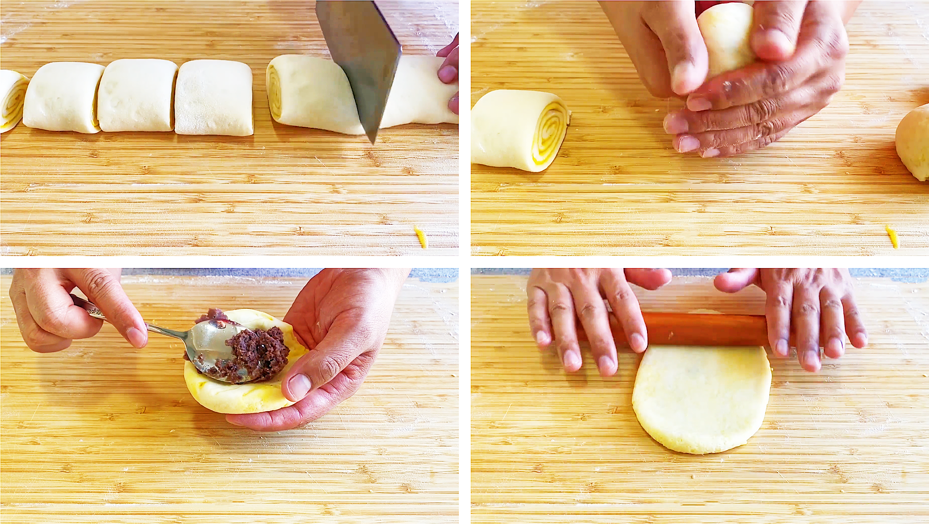 6、处理好之后,然后再切成大小均匀的小剂子,把接口的地方直接向里捏,然后再按扁 ,按压出一个小窝,放入豆沙馅料,然后再捏合收口,团成圆球 按压成小饼
