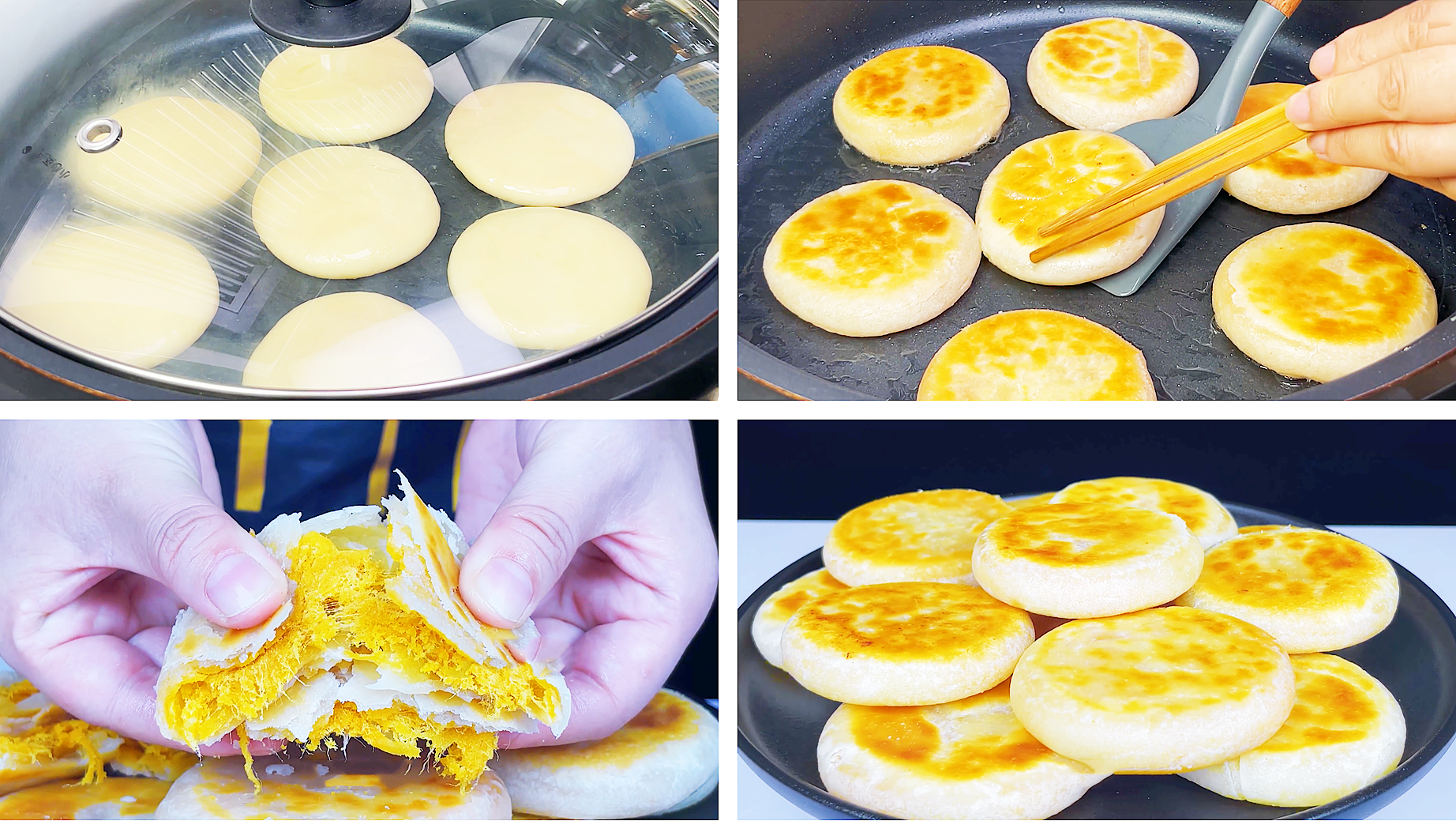 7、小饼烙好之后,直接盛出,美味好吃的肉松饼就做好了,这样做出来的小饼,外皮焦黄酥脆,内心特别的香,吃着特别营养