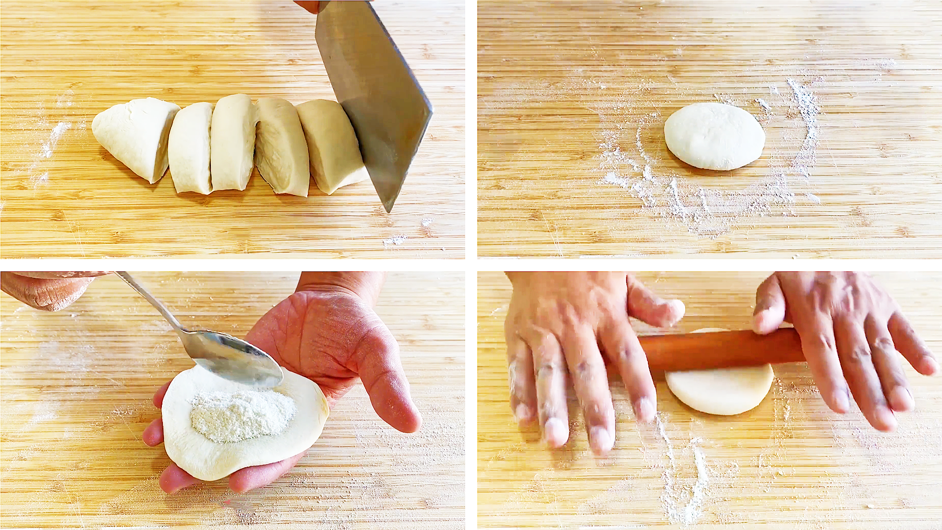 4、面团发酵好之后,取出,然后再揉面排排气,揉好之后,直接团圆按扁,用擀面杖擀成薄面片,不要擀得太薄了,不然影响二次发酵,
