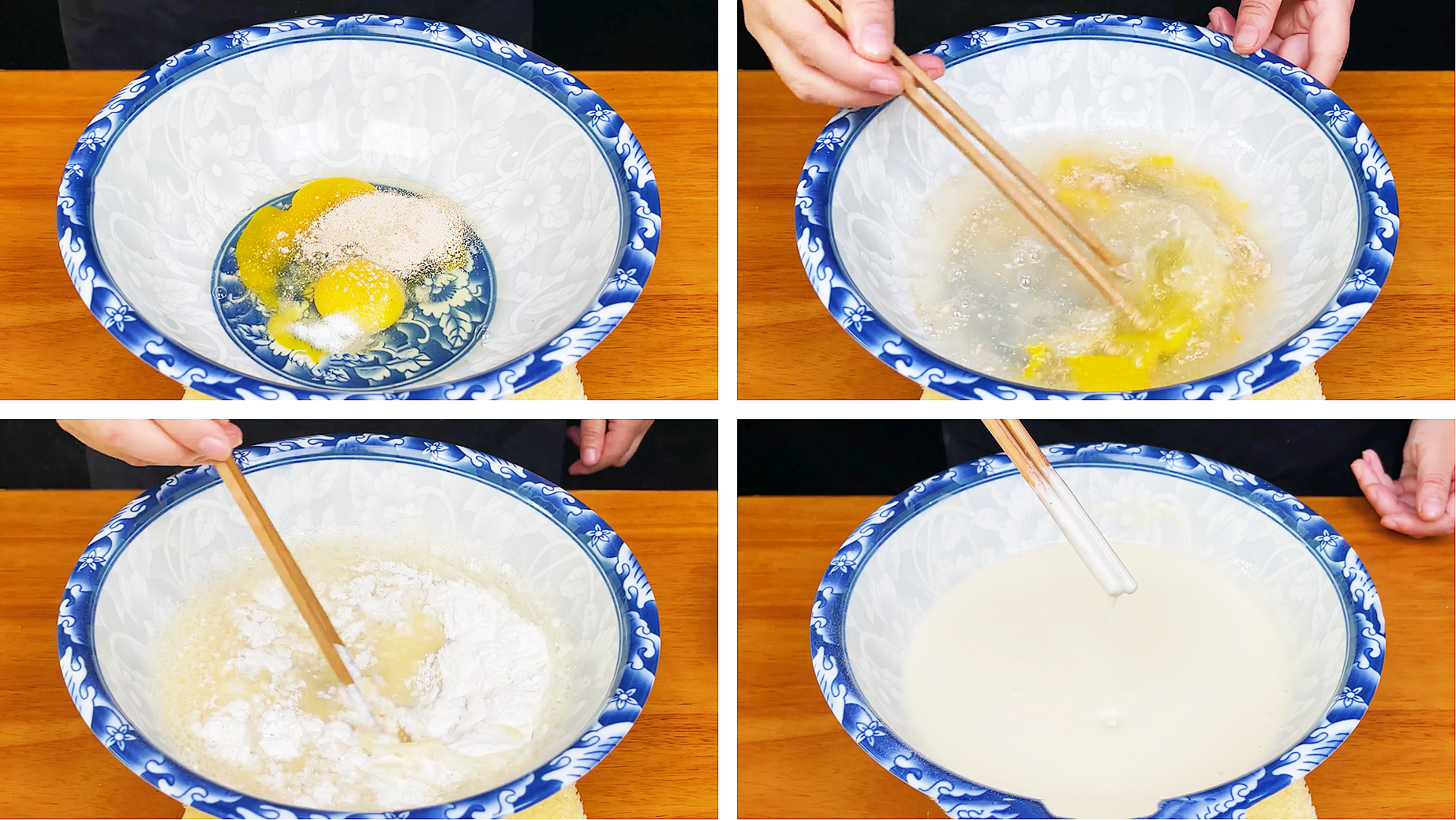1、盆中打进去两个新鲜的鸡蛋,然后再添加5克酵母粉,之后再放入少许白糖促进发酵,充分地搅拌成鸡蛋液,之后再往里面少量多次的添加面粉,边添加边搅拌,一直搅拌成没有干面粉颗粒的稀面糊,然后盖上盖子,放在一边发酵60分钟左右