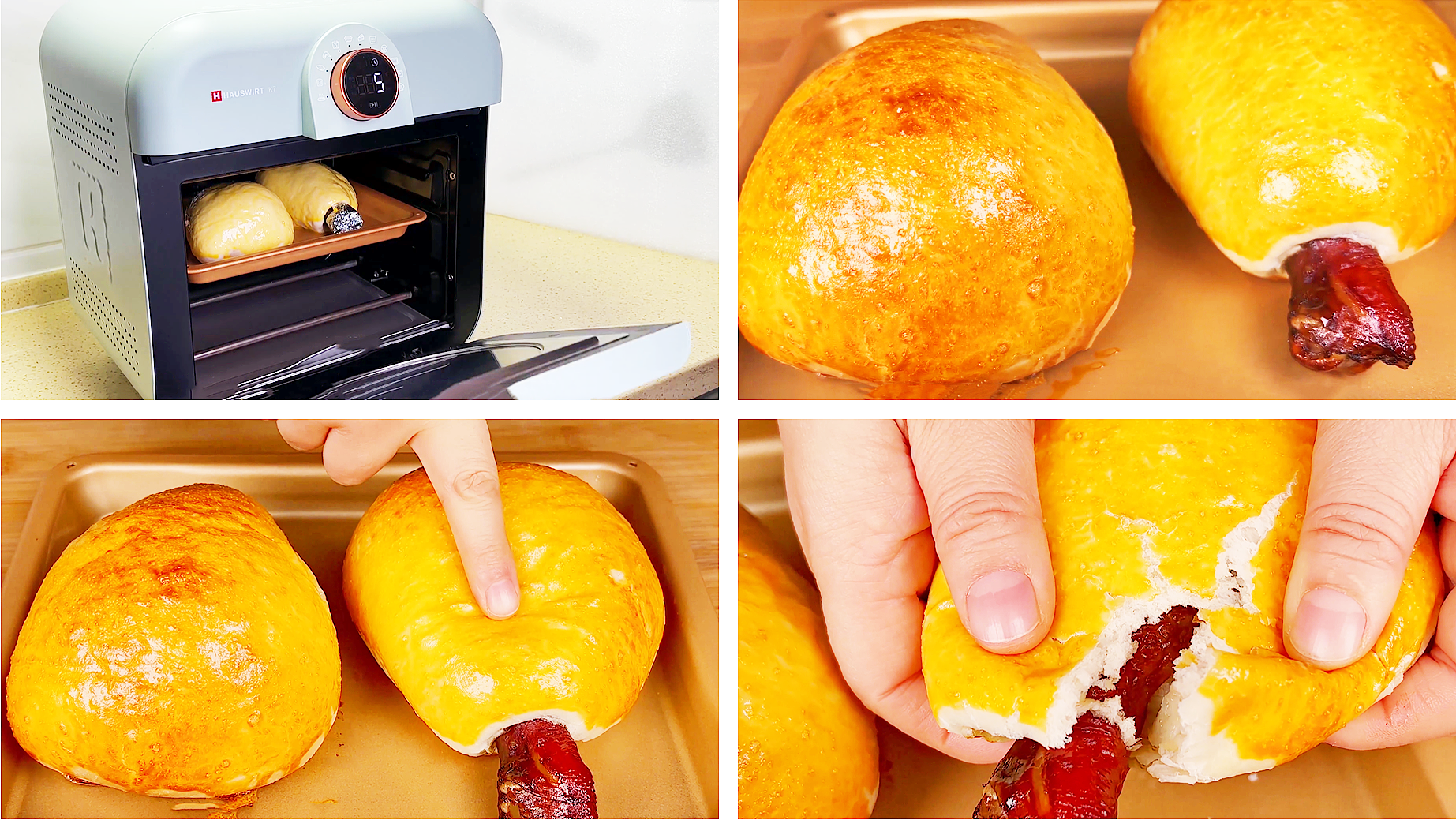 6,面剂发酵好之后,取出放进烤盘里面,再放进烤箱里面,烙20分钟左右,烤好取出,外皮焦黄焦黄的,美味好吃的鸡腿面包就做好了。