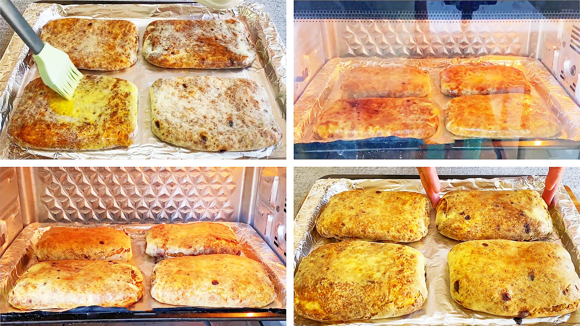 6、把烤盘放进预热好的烤箱里面,上下火180度,直接烤15分钟左右,也可以根据自家烤箱的脾气,自行调整时间,烤到饼鼓起 焦黄酥脆 就可以关火了,=美味好吃的空心烧饼就做好了、。