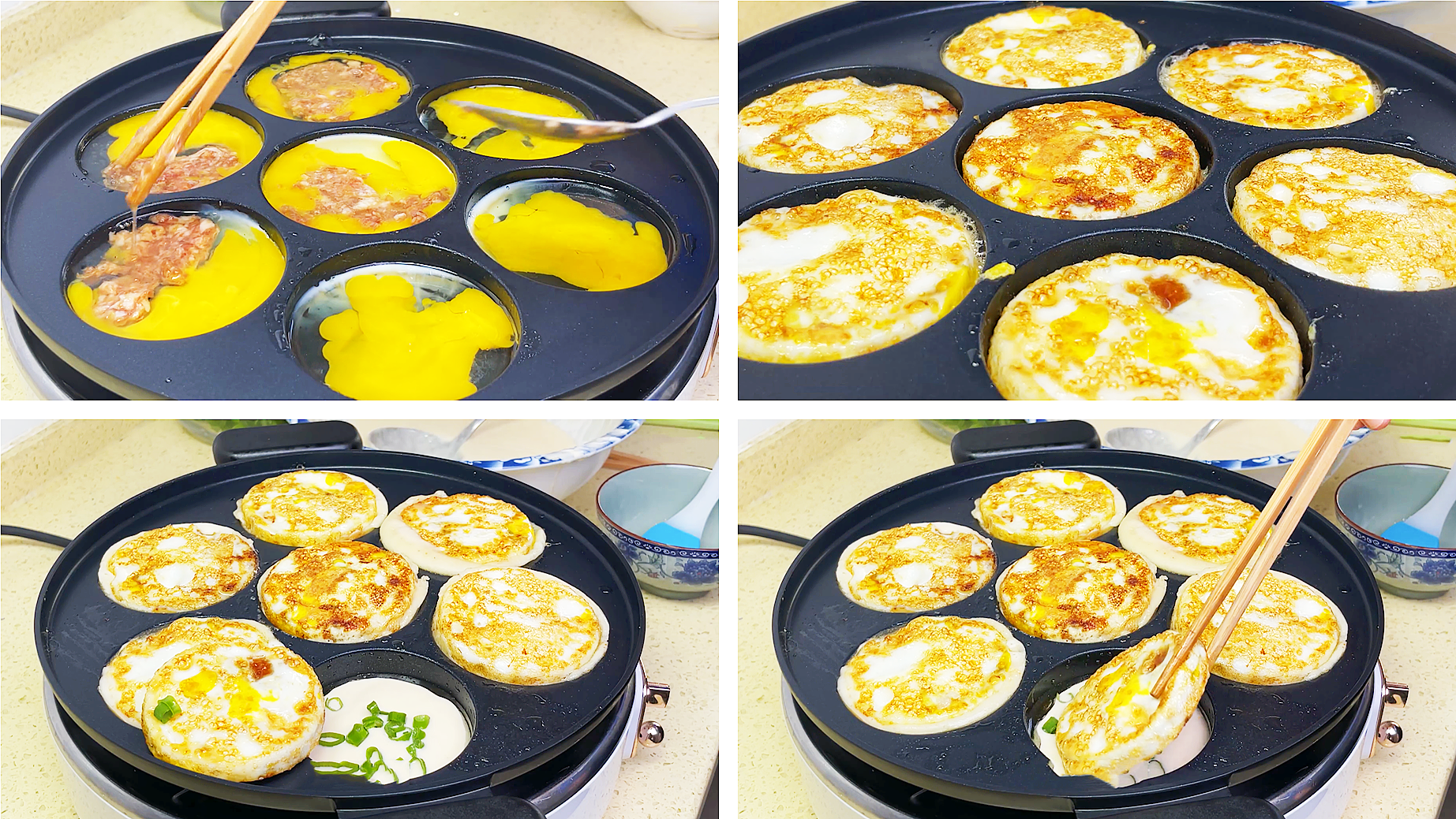 5、烙好之后取出来 底部刷食用油,放入面糊 再放入一些葱花,然后再放入烙好的鸡蛋,面糊底部烙到定型之后,再刷油 放入面糊葱花,把鸡蛋的另一面给倒扣过来,两面都烙好之后取出,继续做下一个