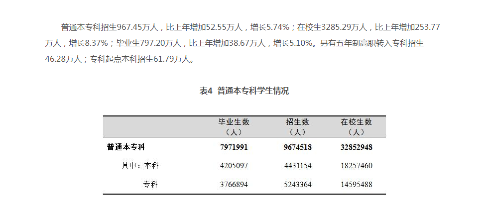 在20年的教育公报中,显示20年普通本专科一共招了967.45万人,在这其中本科生只占440多万人,而专科生却高达524万人以上。