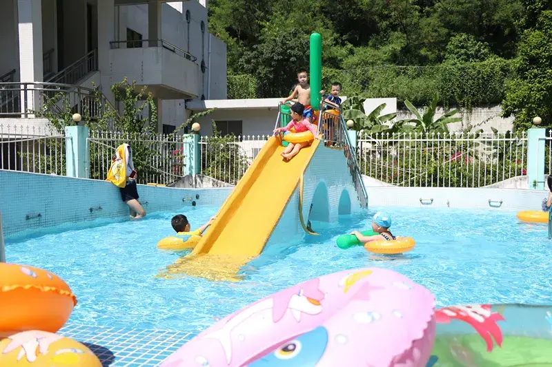 园内设有趣味三色实景果岭、儿童高尔夫球场、9米攀岩、游泳池、迷你山洞、沙池、快乐农场等。