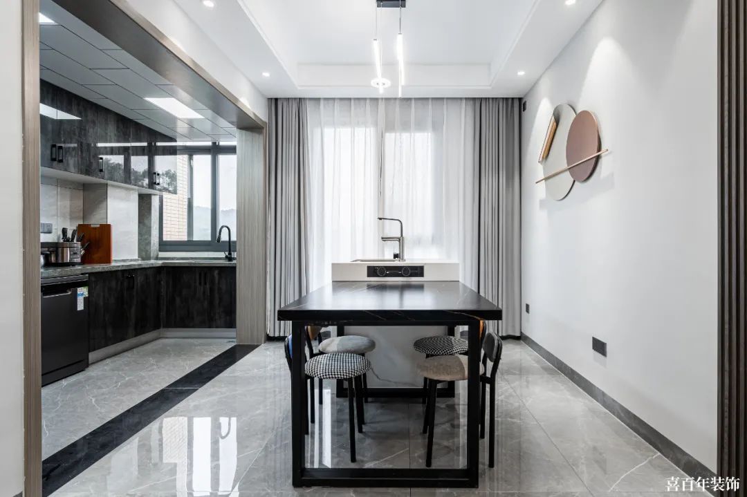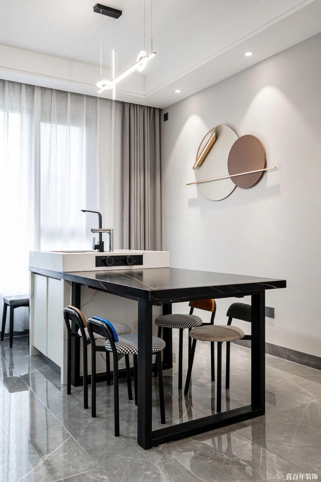 餐厅部分女主人并不想循规蹈矩摆上餐桌,而是结合了岛台+餐桌的形式。用“咬合型”的设计延伸功能。底部埋排水管做单台盆,平时洗水果、备餐、调饮料都是个好去处。