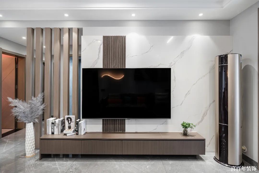 一入户门,大气耐看的连纹喷墨大板和实木栅格混装的背景墙十分抢眼,极具女主人喜欢的现代风情。