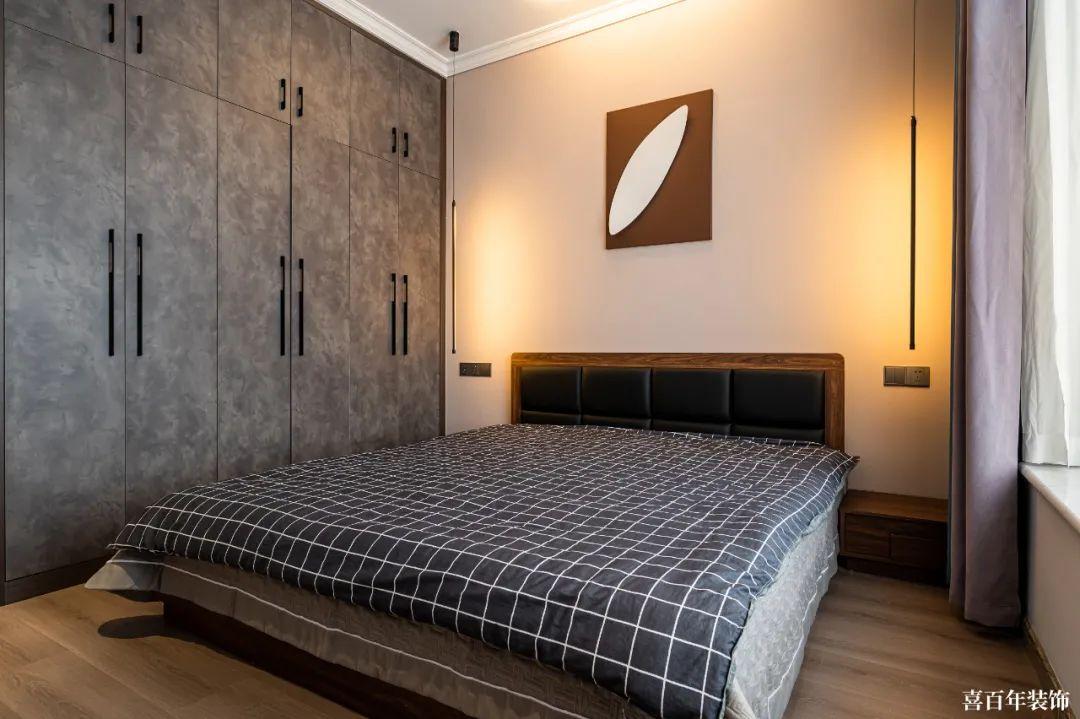 主卧更加沉稳耐看,木色+咖啡的配色温馨好打理,线性床头灯增加了现代造型感,整体更偏实用宜居。
