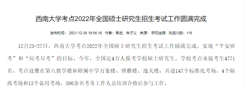 2022年西南大学报考硕士研究生人数近4万人,学校整体报录比约为8:1。