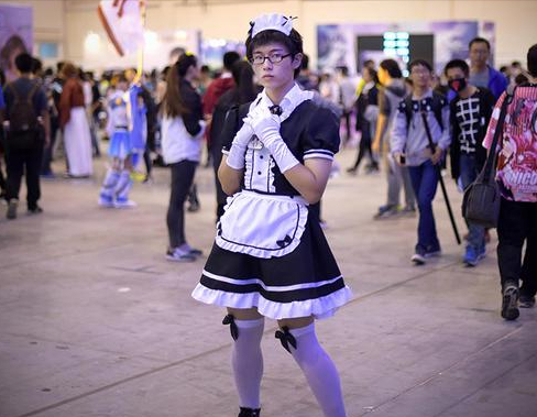 在大学报到日当天,这个男生别出心裁穿了一身用来COSPLAY动漫人物的“女仆装”,配着雪白的丝袜和夸张的女士假发,拿着行李悠然自得的漫步校园。