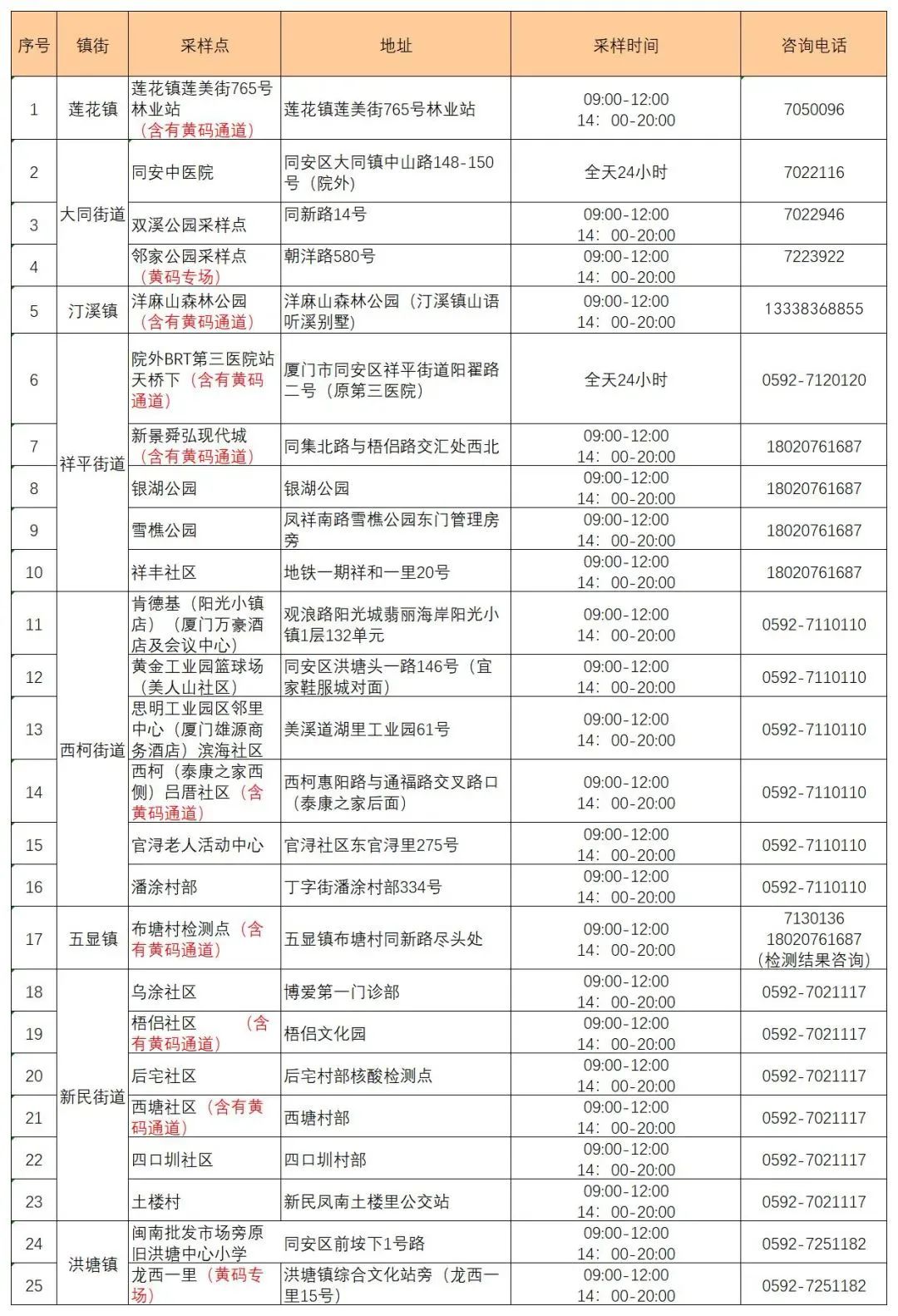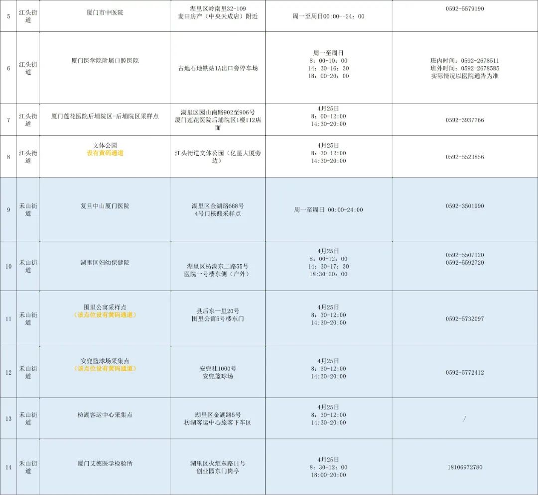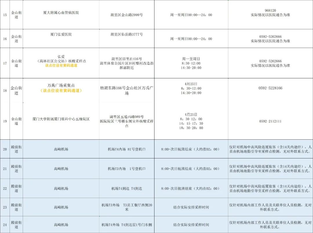 4月25日,湖里区设置24个便民采样点(6个采样点设置黄码通道),为市民群众进行核酸检测(点击图片可放大查看,具体开放情况以各点位每日实际为准)。