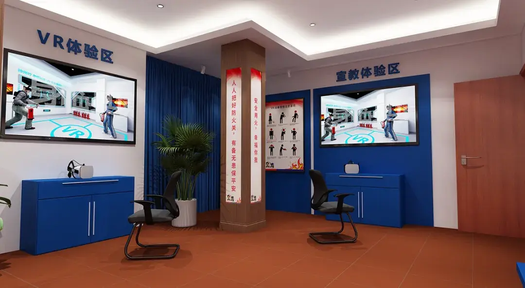 社区VR消防体验馆是重庆渝策经济技术研究院(以下简称:渝策研究院)开发的沉浸式多体感互动体验的消防体验馆。场馆内配备VR头显、LED显示屏与展柜、展板等设备。利用VR技术,让体验者作为主角存在虚拟环境中,真实比例的场景构造,让体验者“沉浸”在直面扑来的火情,步步紧逼的火焰和浓烟中,真实感受火灾情景。在模拟环境中,体验者可操控场景内的物品,进行火情应对操练,以及进行疏散逃生操作。