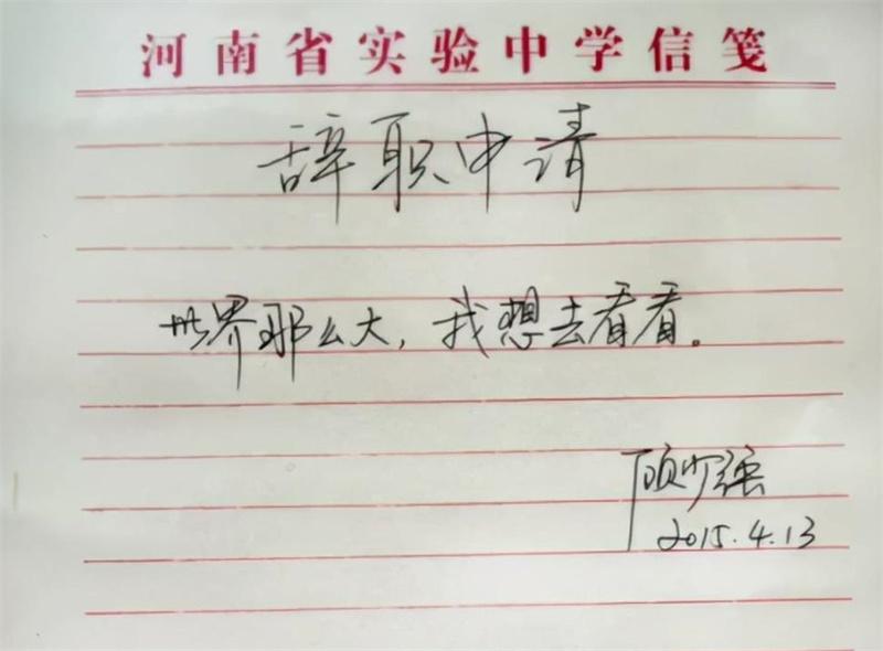 辞职信上没有说辞职的具体原因,只有短短的10个字:世界那么大,我想去看看。