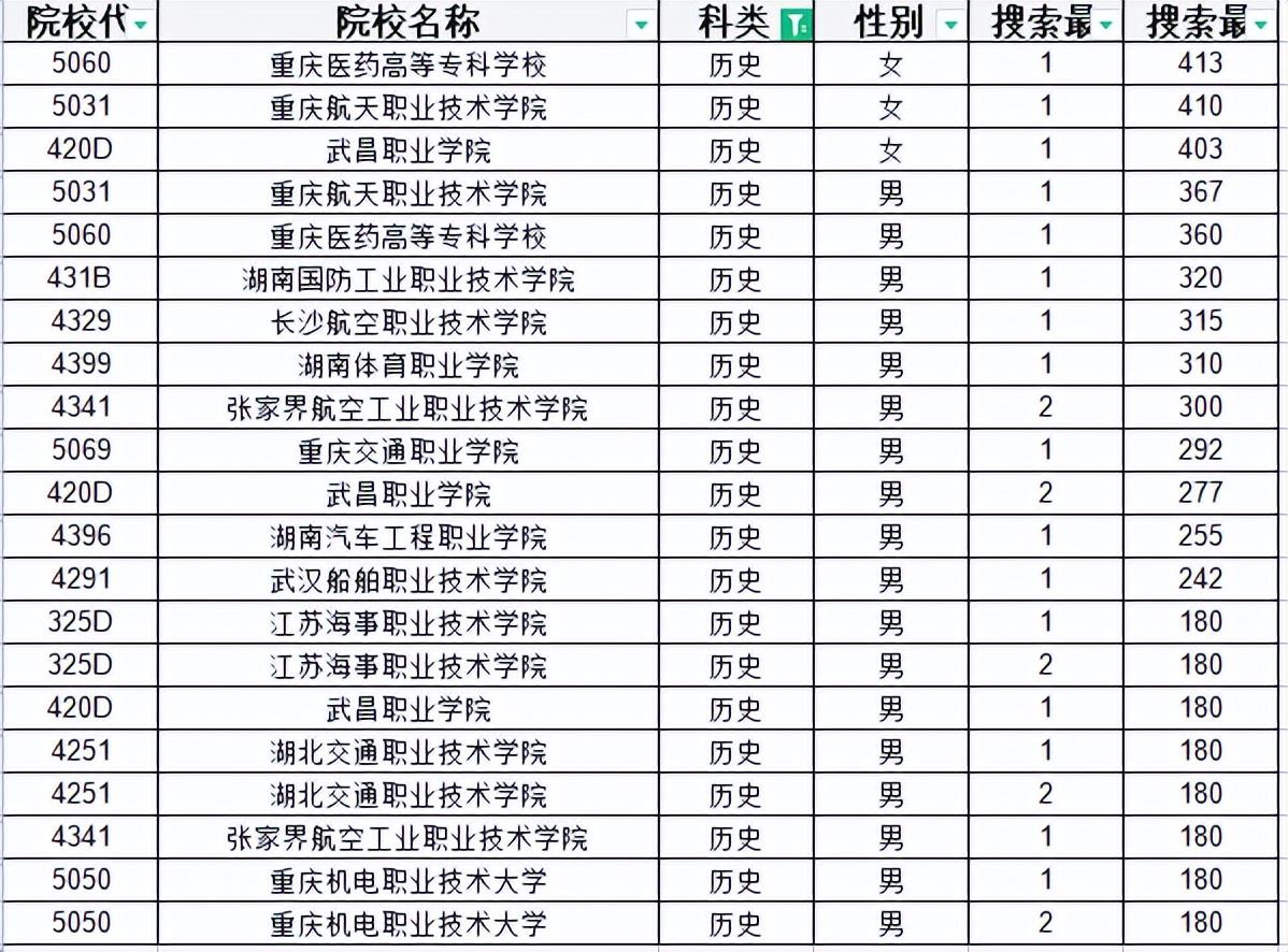 物理类女生有重庆医药高等专科学校的408分、重庆航天职业技术学院的406分、重庆机电职业技术大学的402分和武昌职业学院的379分等4所高校招生;物理类男生最高分是重庆航天职业技术学院的358分、重庆医药高等专科学校的356分、四川邮电职业技术学院的349分等居前三位,最低分也是180分。