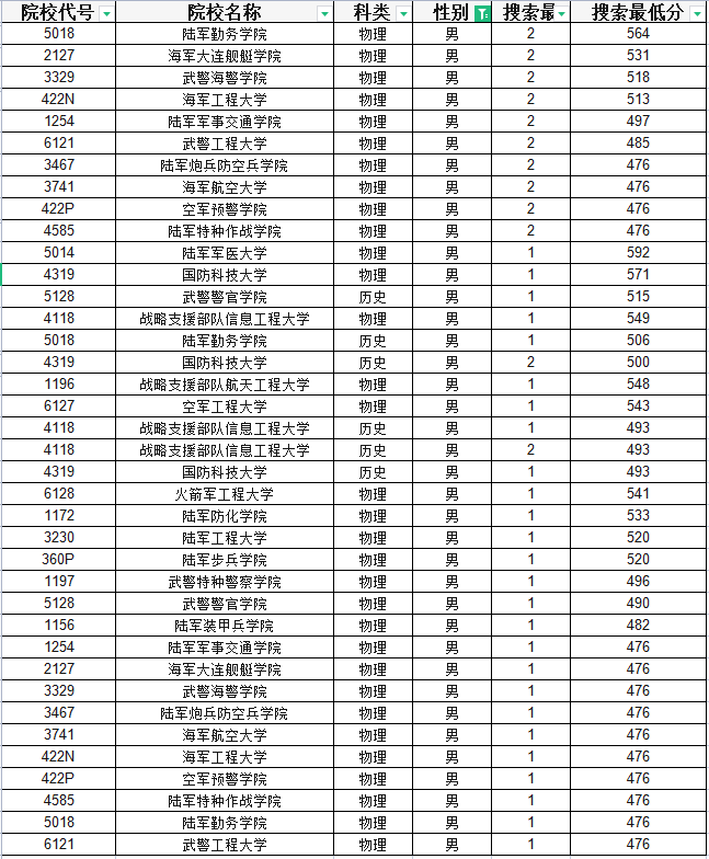 其它高校火箭军工程大学576分、战略支援部队信息工程大学571分、武警工程大学562分、海军大连潜艇学院551分、陆军军事交通学院530分、武警海警学院529分及战略支援部队航天工程大学527分等。