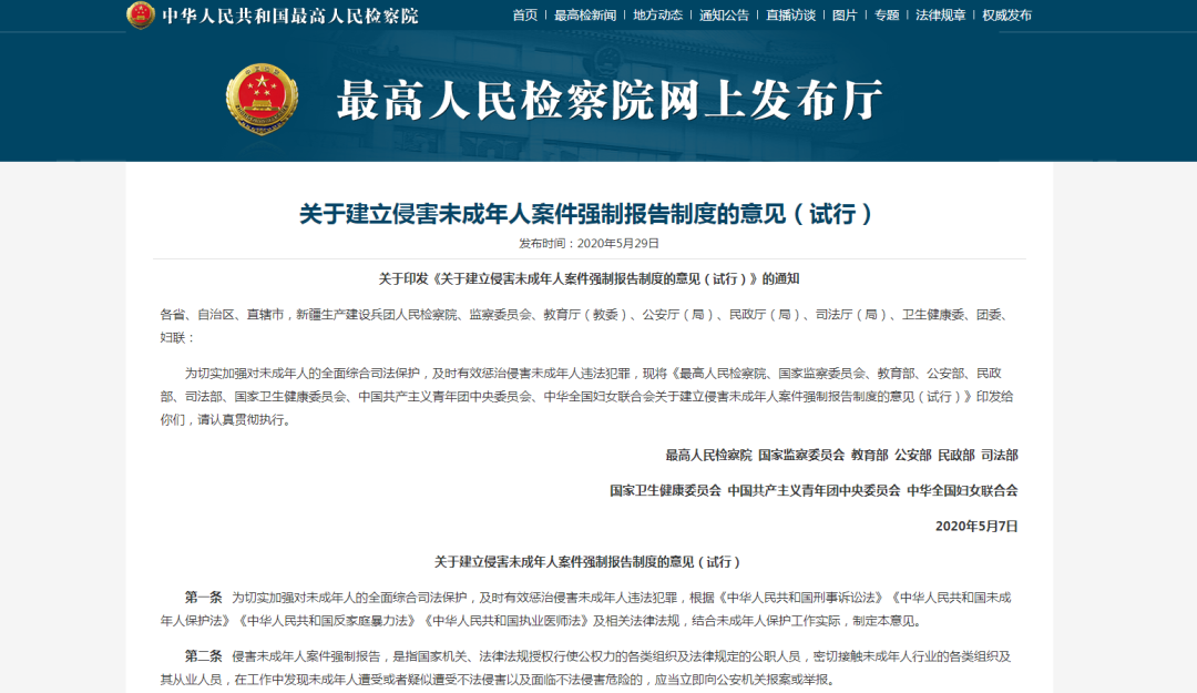 2020年5月,由最高人民检察院联合、国家监察委员会、教育部等九部门联合发布《关于建立侵害未成年人案件强制报告制度的意见(试行)》,正式建立侵害未成年人案件强制报告制度。