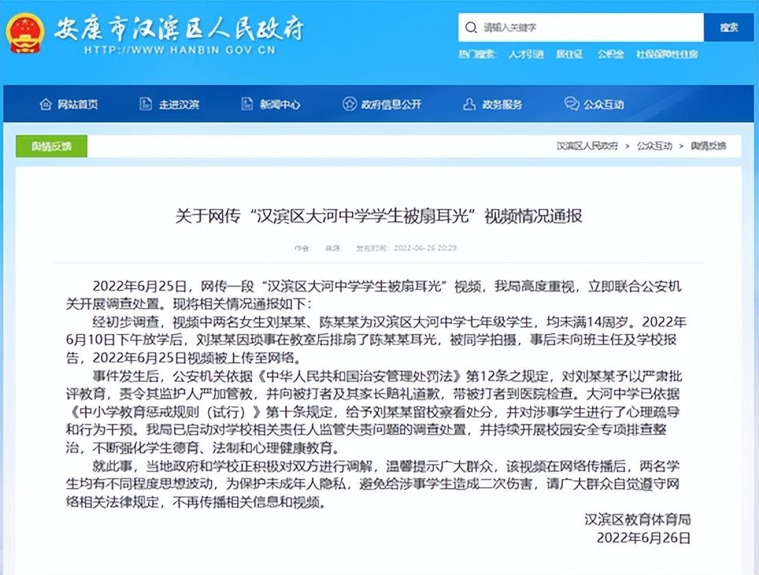 6月25日,网上流传一段“汉滨区大河中学学生被扇耳光”视频,第二天,陕西省安康市汉滨区教体局就在政府官网上发了情况通报,把公安机关、学校、教体局的处理方法向社会公开,公正方面是否到位先不说,这回应速度属实是不慢。