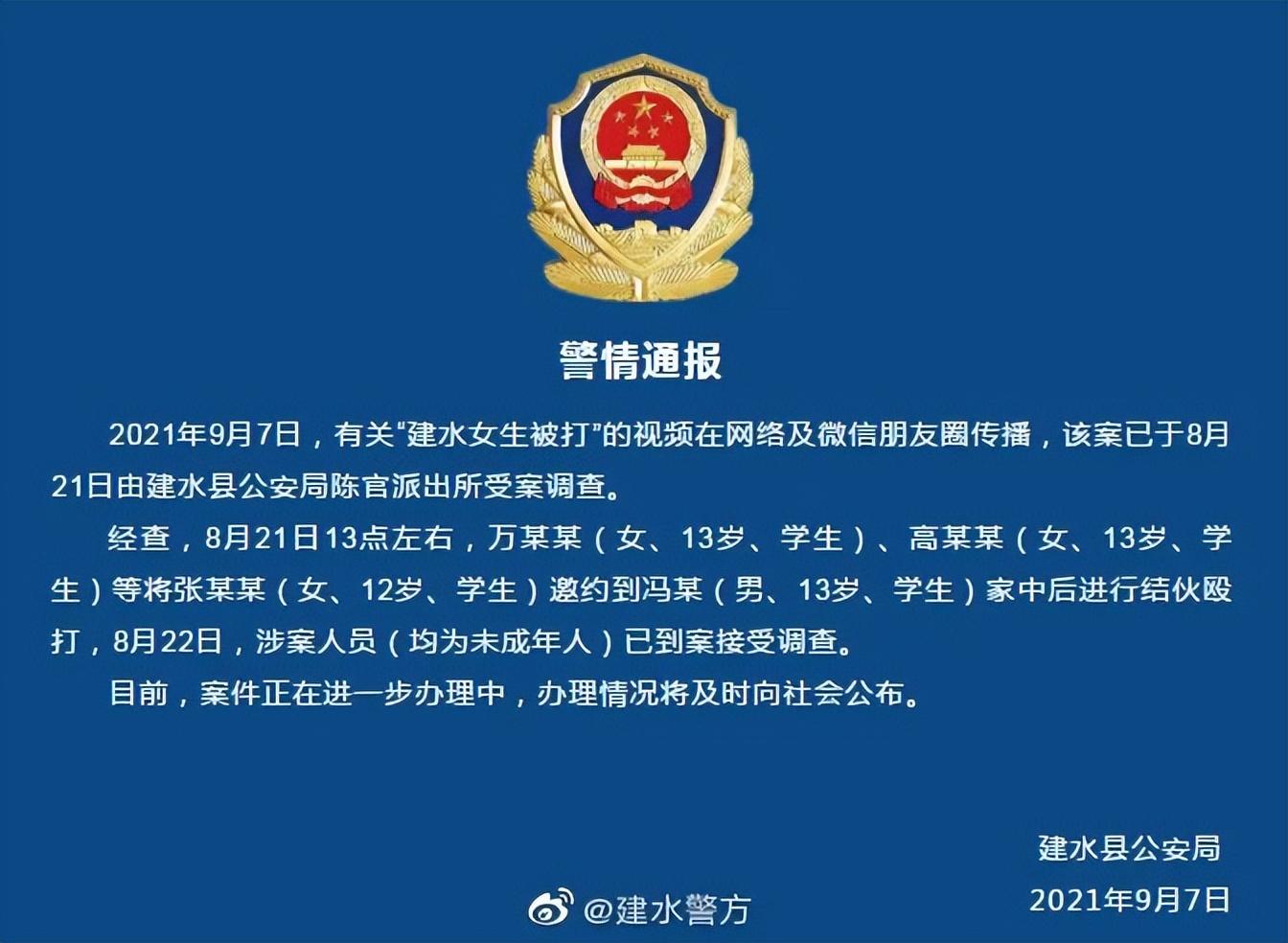 当晚,建水警方即发布警情通报称,经查,8月21日13时左右,万某某(女、13岁、学生)、高某某(女、13岁、学生)等将张某某(女、12岁、学生)邀约到冯某(男、13岁、学生)家中后进行结伙殴打,8月22日,涉案人员(均为未成年人)已到案接受调查。