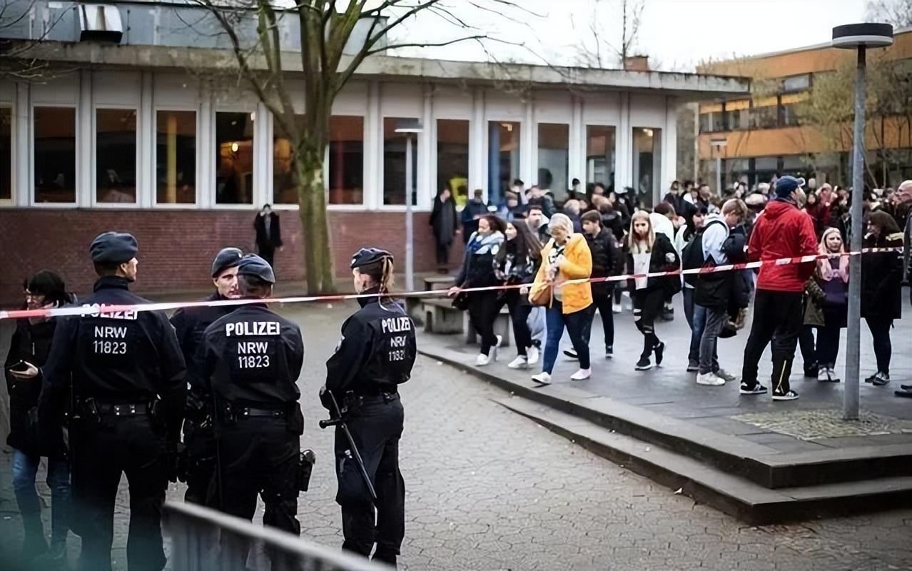 (德国吕嫩,当地学校一名15岁学生将一名14岁学生用刀刺死,警方在现场调查)