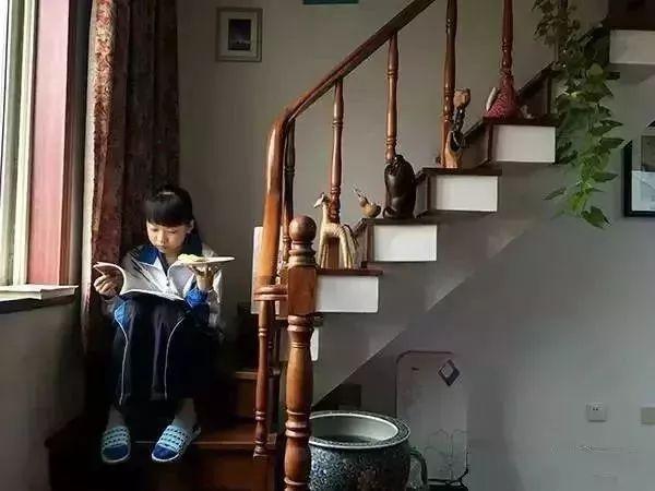 “每天早上,女儿在吃早饭的间隙,也得坐在楼梯上读一会儿课本。”(图源:青岛日报)