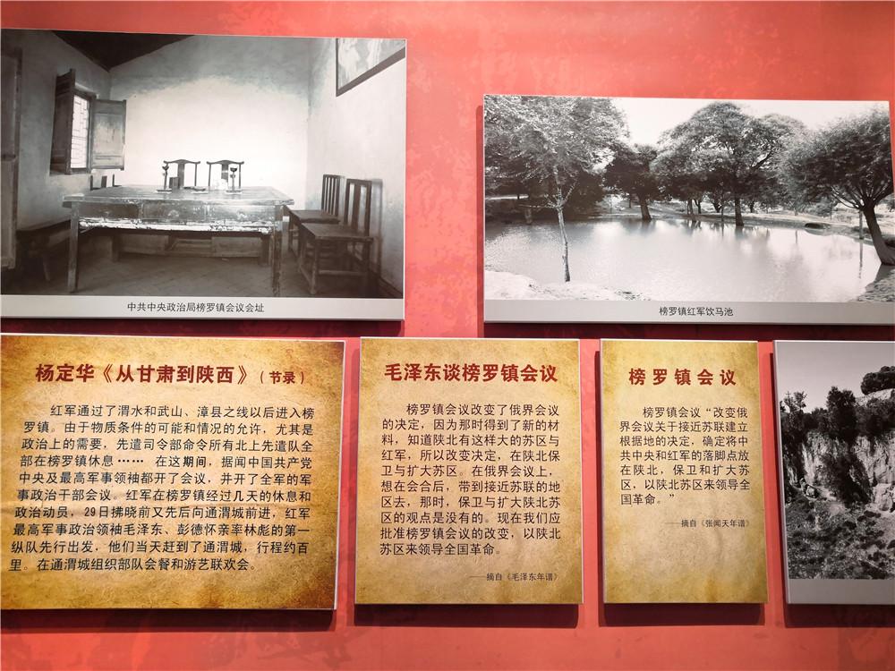 1935年9月26日,中共中央率领陕甘支队自武山进入通渭,9月27日,到达榜罗镇。中央领导人先后看到了许多报纸杂志,了解了当时全国的形势和陕甘革命根据地的情况。当晚,在榜罗镇小学校长室,中共中央召开了政治局会议,毛泽东、张闻天、周恩来、博古、王稼祥出席了会议,史称"榜罗镇会议"。会议讨论了党和红军面临的任务,研究确定了今后的战略方针。会议改变了俄界会议关于接近苏联建立根据地的决定,正式决定将中共中央和红军长征的落脚点放在陕北,以陕甘苏区作为领导中国革命的大本营。