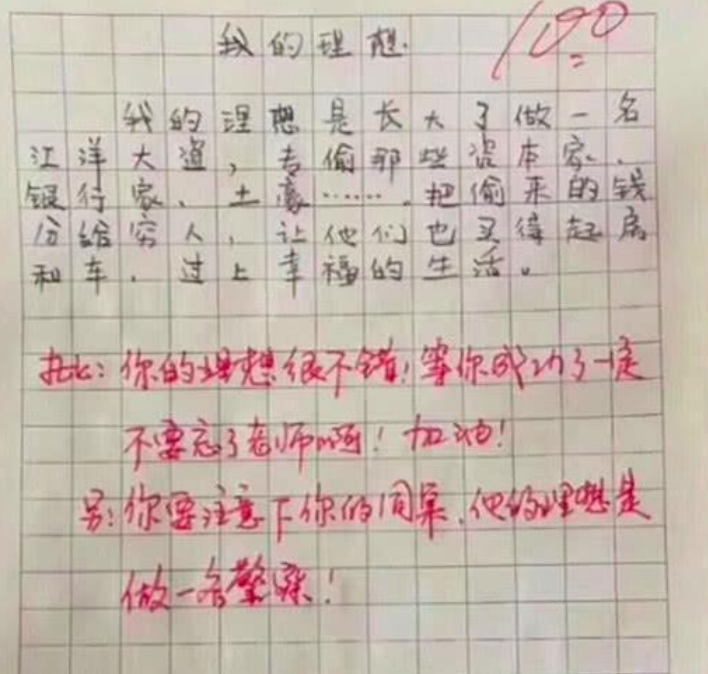 这篇小学生的作文可以说是写的十分有勇气了,她的理想可能也是万千小学生的梦想,每个小学生都有一个想要老师消失可以天气不好可以放假的梦想,但是这样的理想真是让老师哭笑不得,可以说这个小学生勇气可嘉,可能老师的整体素质还有得到他想要的提高,就被老师叫家长了