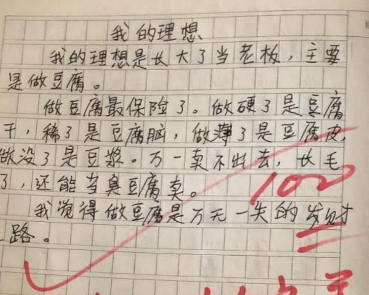 这个小学生的理想可以说是非常的有经济头脑了,而且目标明确,连可能出现的问题和结果都想明白了,还能想到稳赚不赔,可以说真是思路清奇,以后长大了没准是一个做生意的天才,将来能成为一个大老板也是非常有可能的。