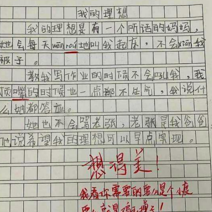 这位同学的理想可谓是比较贴近自己的生活了,但是不知道这位同学的妈妈看到这篇作文会作何感想,但是这个小学生的理想可能说是很难实现了,因为有时候温柔的妈妈也是需一个听话的孩子的。