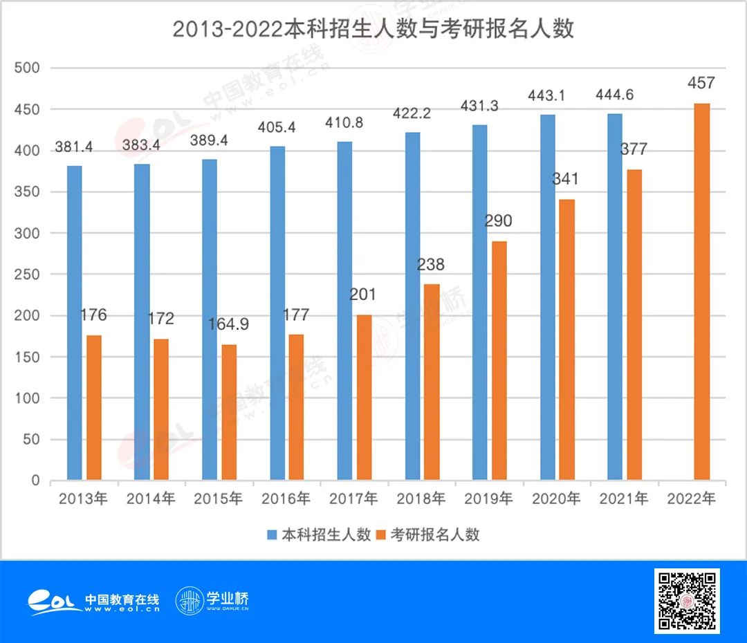 1、本科招生人数不断增加,导致考研基数进一步扩大。2022年考研报名人数为457万人,作为本届考研主力军的2018级学生,当年本科招生422万人,考研报名人数已经远超应届毕业生人数,也侧面反映出往届考生占比越来越重。此后,本科招生人数还在不断增长中,可以预见之后几年的考研报名人数还将持续增长。