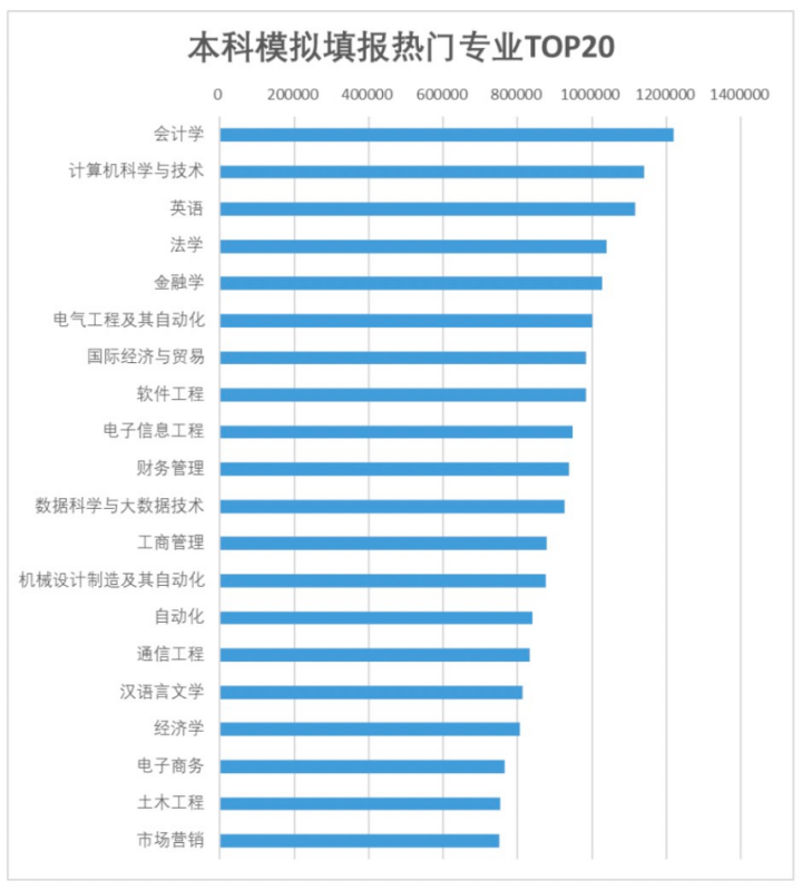 除了会计学热,计算机相关专业,依旧热度不减。模拟填报前十的专业中,计算机相关专业共有三个,分别是计算机科学与技术、软件工程、电子信息工程。金融学和英语则是传统报考热门专业。此外,法学专业虽屡亮“红牌”,但仍居模拟填报前列。