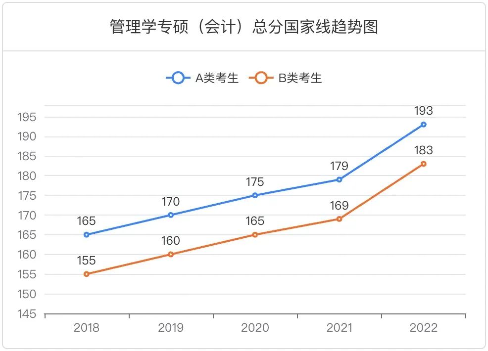 以本科热门模拟填报专业的TOP1——会计学为例,其专硕国家线在短短5年内上涨了28分。