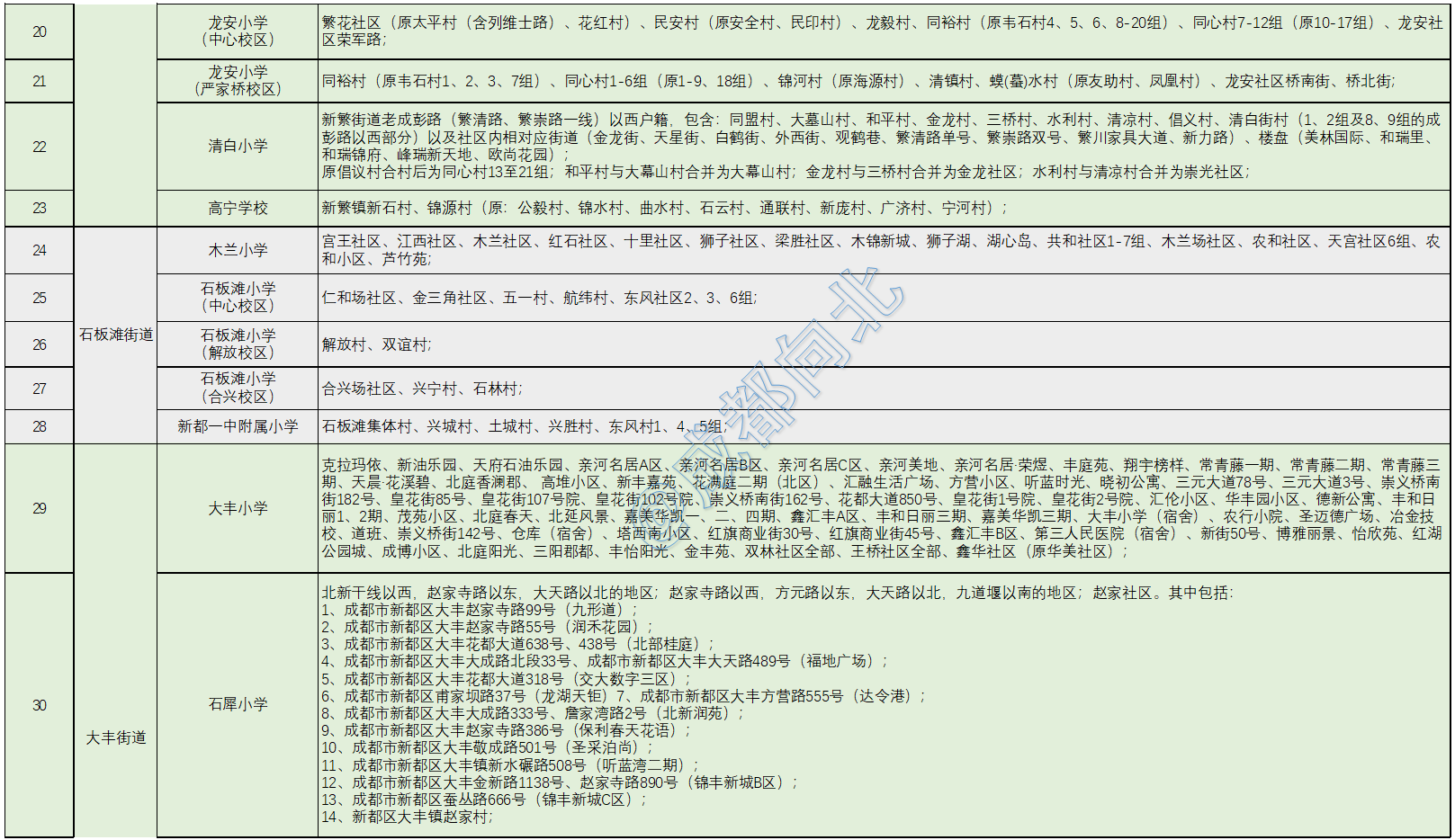 新都街道宝光村、三王村、督桥村、五里村、高架村、封赐村、福缘村、新东村、新水村、城守村、甘露村、茶店村、璧山村、五四街以北、蓉都大道钟楼以北、蓉都大道北段延伸段(钟楼到龙虎口子)、宝光大道北段单号111号以北(111号以上的大号)、双号172号以北(174号以上的大号)、新光路、北新路、文家一巷、文家二巷