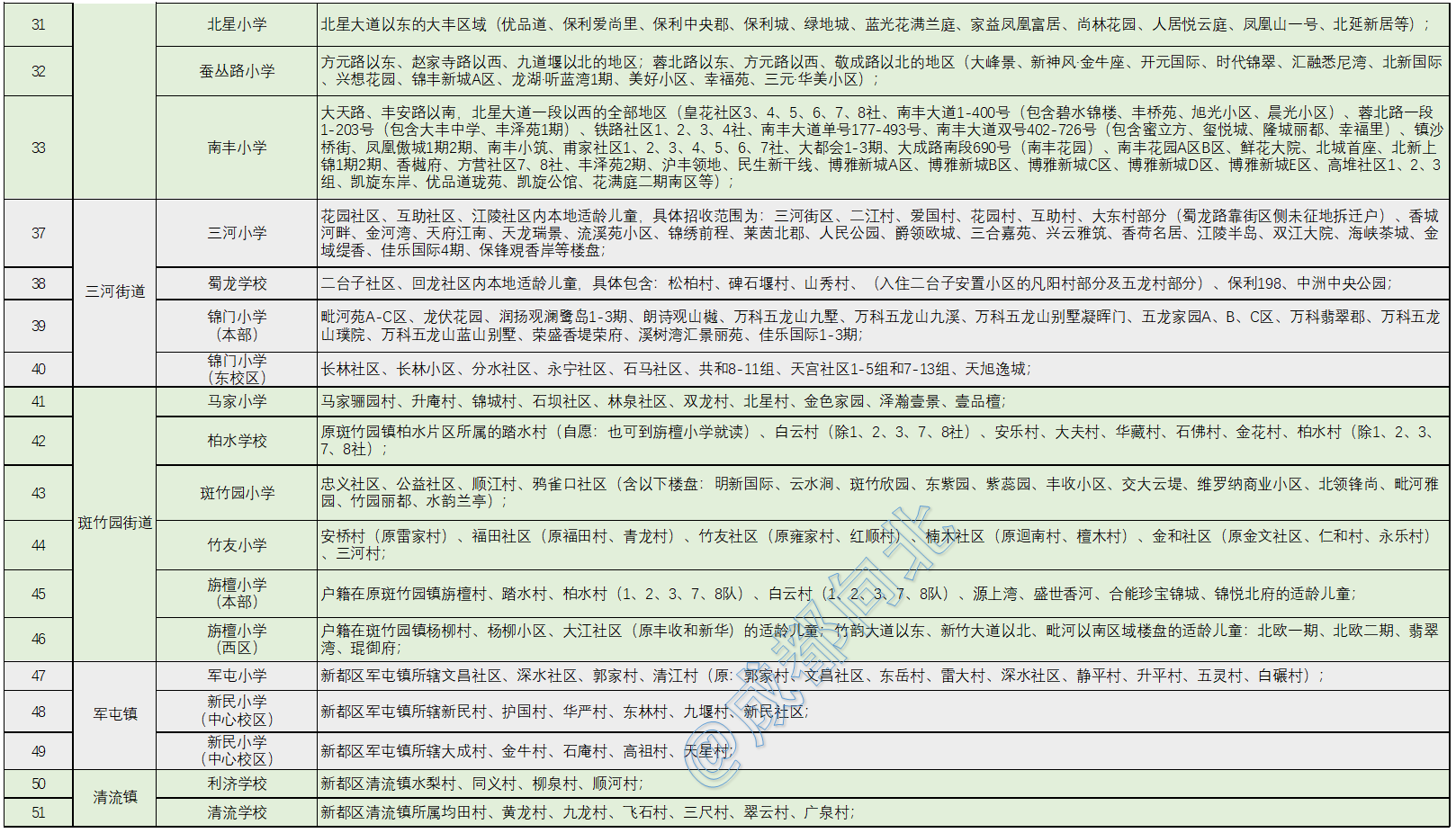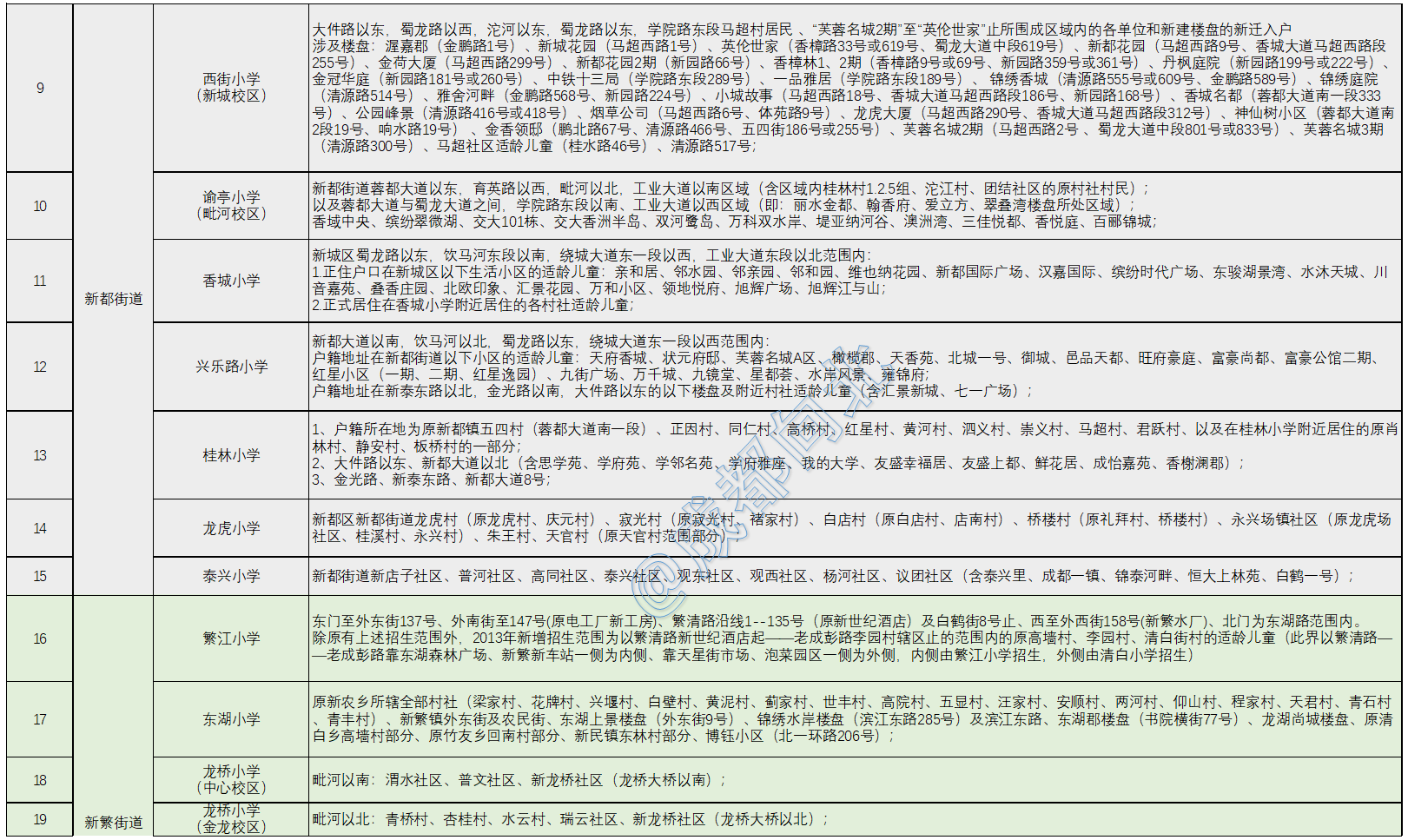 1、户籍所在地为原新都镇五四村(蓉都大道南一段)、正因村、同仁村、高桥村、红星村、黄河村、泗义村、崇义村、马超村、君跃村、以及在桂林小学附近居住的原肖林村、静安村、板桥村的一部分